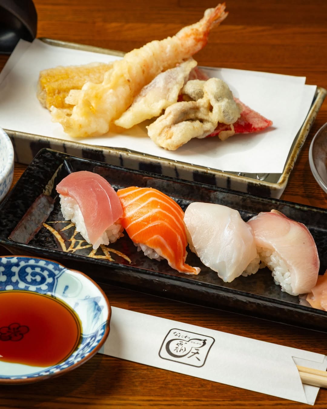 includes 4 pieces of sushi, 5 pieces of tempura,