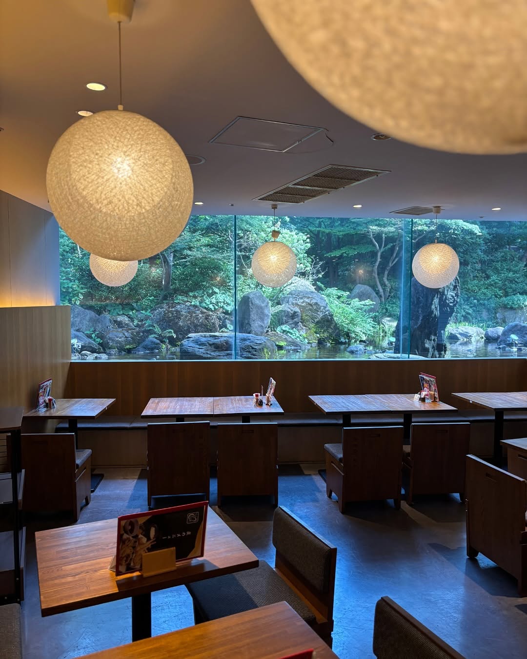 自然光が差し込み、庭園や滝の景色を眺めながら、ゆったりとしたひとときをお過ごしいただけます。