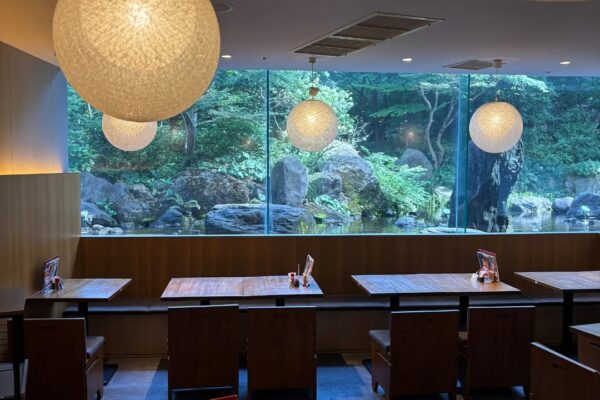 当店は、大きなガラス窓が広がる開放的な店内。 自然光が差し込み、庭園や滝の景色を眺めながら、ゆったりとしたひとときをお過ごしいただけます。 お席はすべてテーブルタイプで、全45席をご用意。 ご友人との…